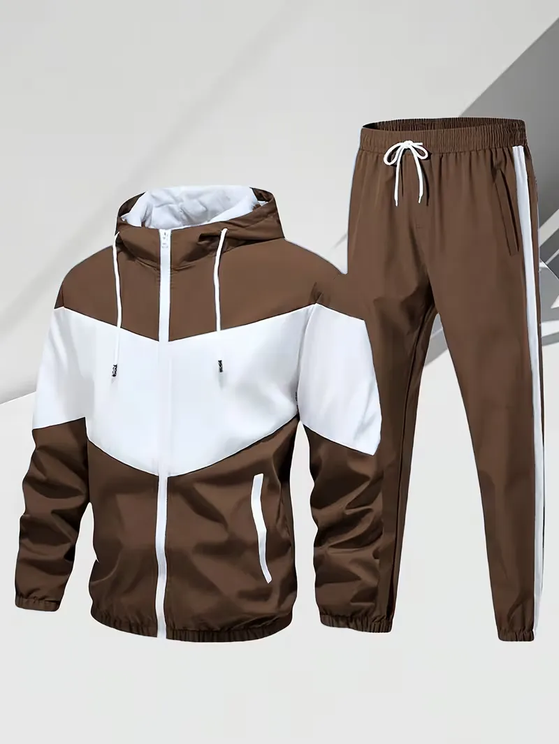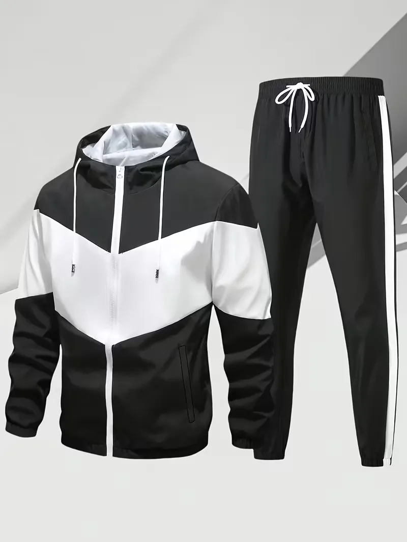 Featuring a loose-fit silhouette and trendy color-block design, this outfit delivers a modern streetwear look while allowing easy movement. The hooded jacket adds extra warmth and casual appeal, making it suitable for daily wear, travel, workouts, or relaxed outdoor activities.