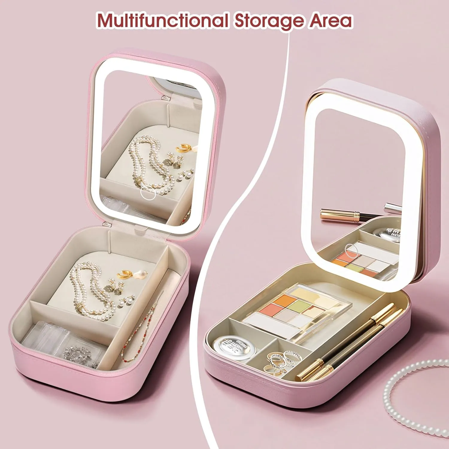Enhance your beauty routine with this elegant LED lighted makeup mirror jewelry storage box. Designed with a soft pastel finish and a sleek rectangular shape, it combines functionality and style in one compact accessory. The built in mirror is surrounded by bright LED lighting that provides clear and even illumination for flawless makeup application.