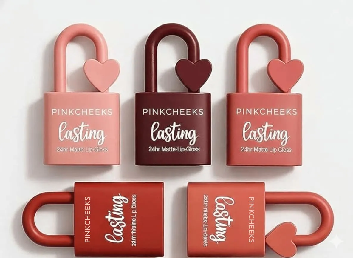 Elevate your makeup collection with this Pinkcheeks Lasting 24hr Matte Lip Gloss Set. Featuring a range of beautiful shades from soft pinks to deep reds, this set offers versatile color options for every mood and occasion. Each gloss comes in a unique lock inspired container with a cute heart detail, adding a stylish and playful touch to your beauty essentials.